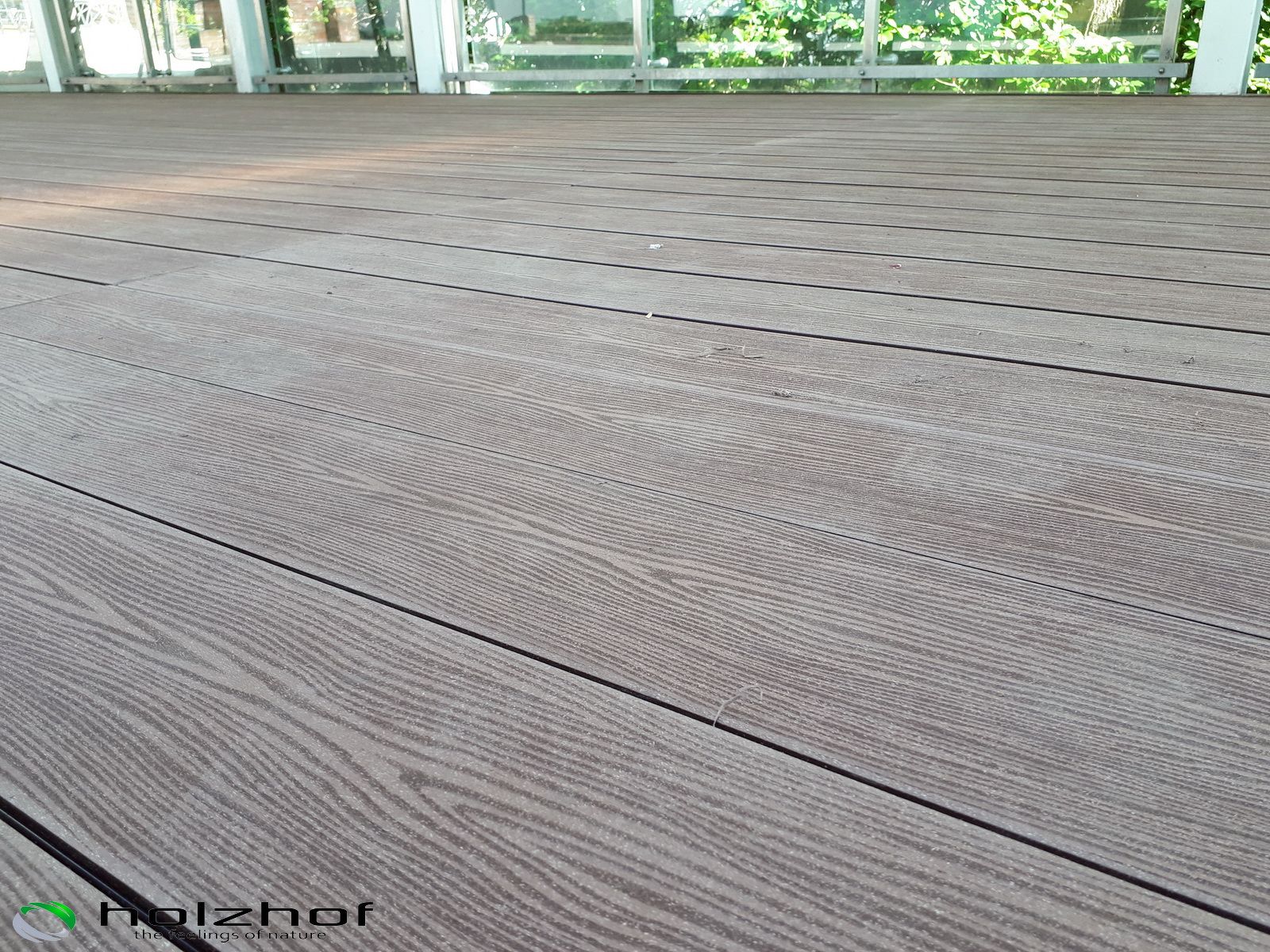 Именно по причине высокой проходимости и высокой нагрузки, для строительства смотровой площадки, необходимо применять только качественные и проверенные комплектующие, такие как: террасная доска Holzhof (коричневого цвета) на основе полиэтилена с глубоким 3D тиснением, которая и стала настоящим украшением пола. Также была применена высокопрочная Лага из ДПК с двумя ребрами жесткости и, конечно же, современная 3D клипса HILST.